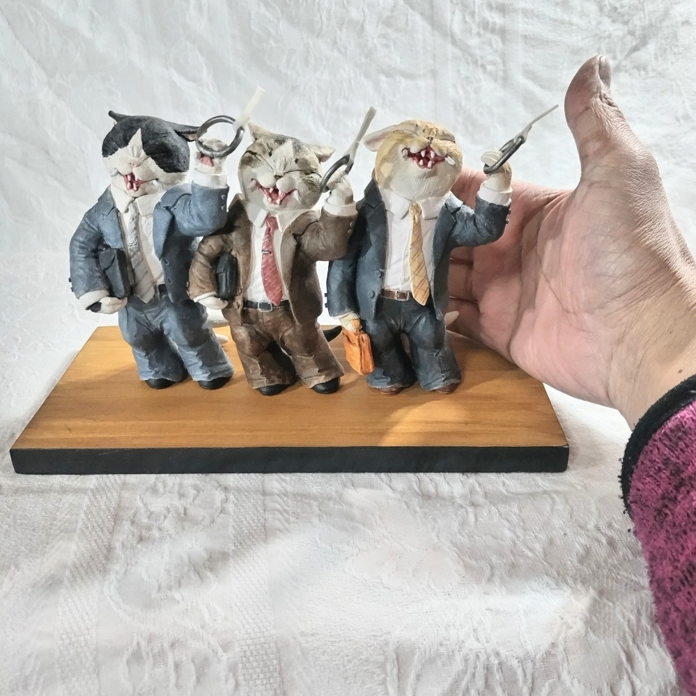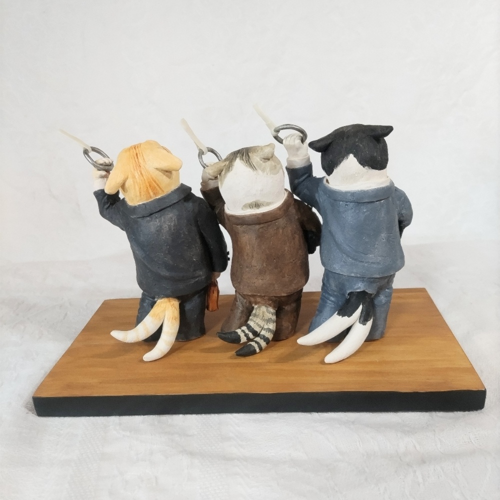 つり革を持って電車に揺られる3匹の化猫サラリーマン。猫又尻尾もプリティ。